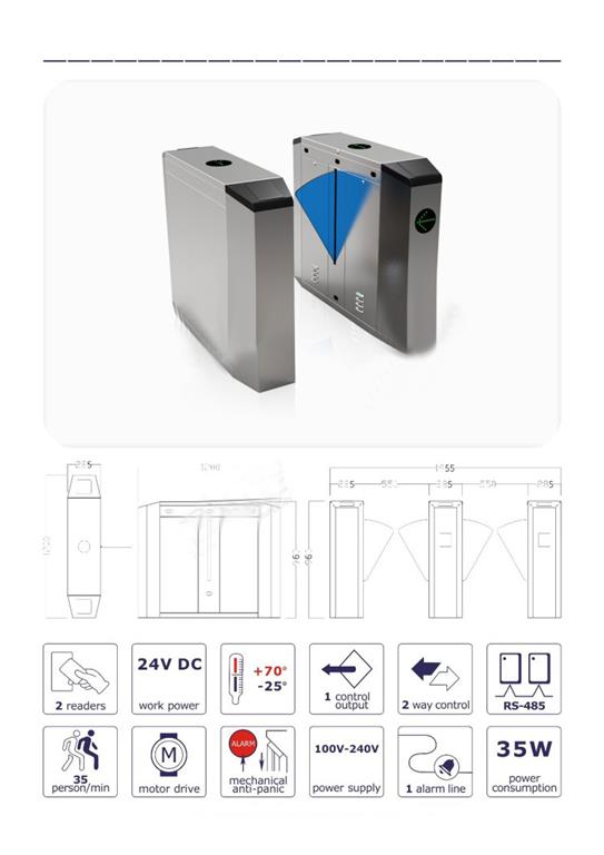 翼閘E242 1.尺寸:1200x280x960mm 2.解鎖時(shí)間: 0.2s 3.通行速度: 35 person/min 4.通道寬: ≤550mm 5.輸入電壓: 100V~240V 6.驅(qū)動(dòng)電壓: 24v 7.環(huán)境溫度: -25~+70℃ 8.功率: 30w 9.開(kāi)閘信號(hào)輸入: 干接點(diǎn) 10.產(chǎn)品包裝: 珍珠棉加紙箱 11.產(chǎn)品型號(hào):